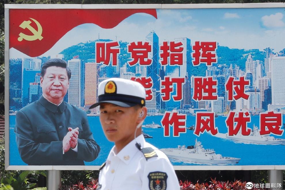 2019年6月30日,在香港九龍昂船洲海陸兩軍基地,一名中國人民解放軍站在中國領導人習近平的宣傳標語前。