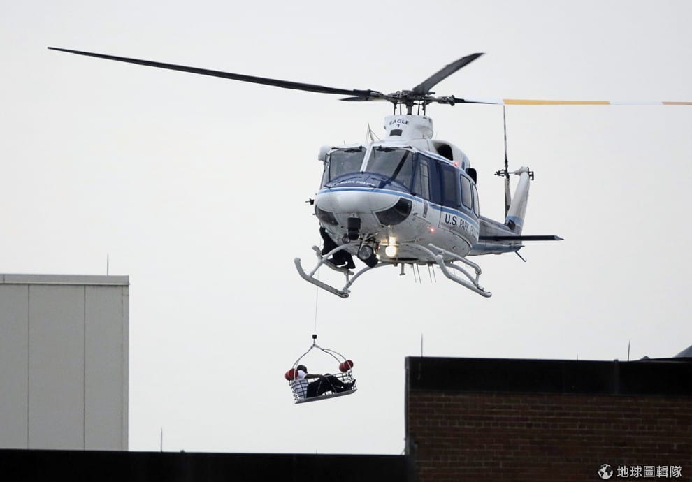 地球圖輯隊直升機以吊掛的方式將一位傷患撤出槍案現場。