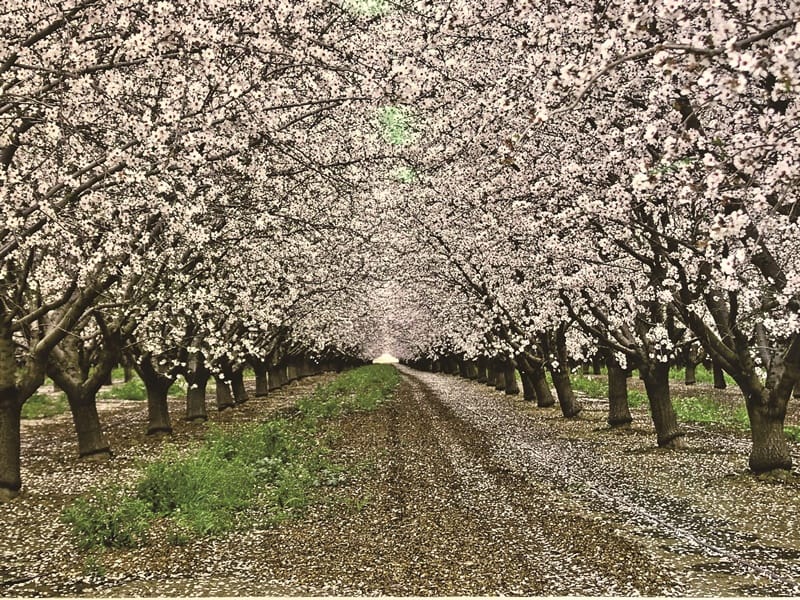 杏仁樹從開花到結果收成需六個月的時間。圖為2月杏仁樹開花,一片花海美不勝收。