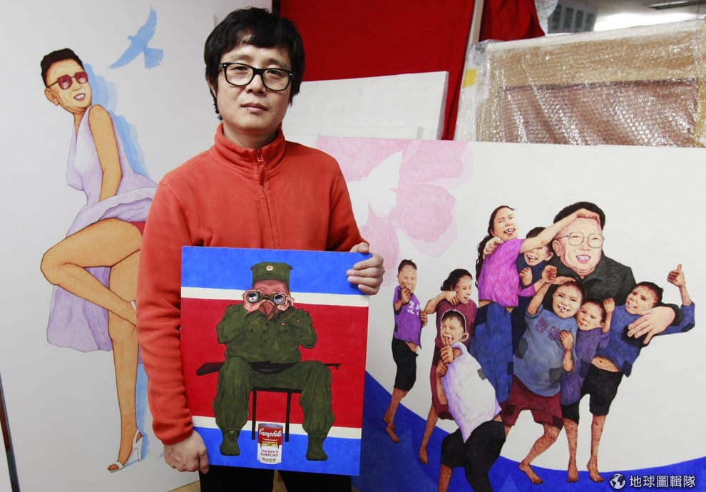 照片中為從北韓逃出來的逃亡畫家 Song Byeok 與他的畫作。過去他在北韓當宣傳畫畫家,2002年逃到南韓後就開始改畫政治諷刺畫,照片背景中的其中一幅畫作結合了北韓前領導人金正日的臉與瑪麗蓮夢露的性感身體。