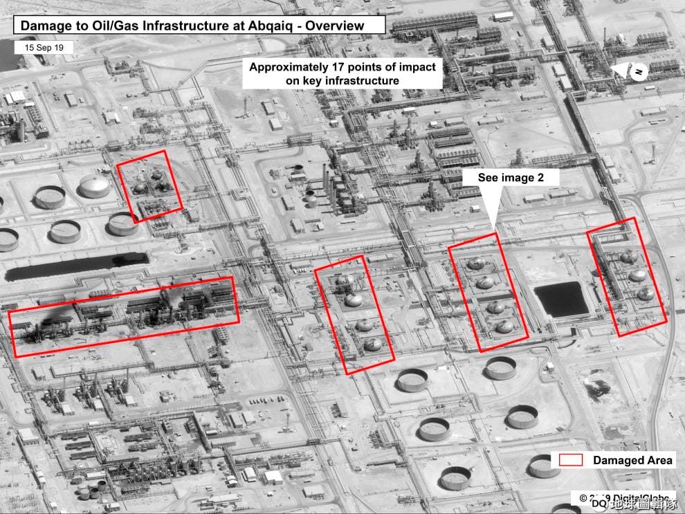 周六(14),10多架無人機飛到沙烏地阿拉伯國家石油公司(Saudi Aramco)位於阿布蓋格(Abqaiq)的煉油廠和胡萊斯(Khurais)油田上空發動攻擊,導致這兩處發生大火,影響沙國的石油生產和出口。