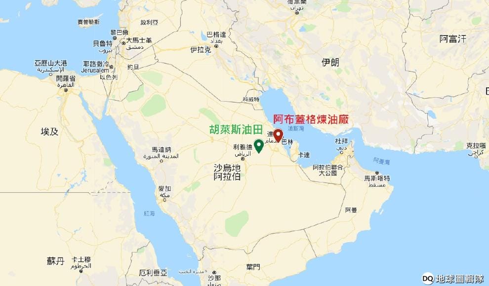 沙國國家石油公司稱阿布蓋格煉油廠(紅色地標)是「全世界最大的原油穩定廠」,它位於沙國東部省達蘭(Dhahran)地區西北方約 60公里處。這座煉油廠可以將含硫原油煉成硫含量低於 0.5%的甜原油,然後送往波斯灣和紅海的轉運點運往世界各地,初估這裡每天可以處理高達 700萬桶的原油。