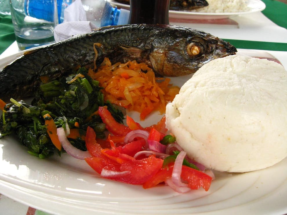 在圖中餐盤右方的一大團白色物就是玉米粉餐點。玉米粉餐點在非洲不同國家有不同的稱呼,尚比亞稱其為nshima,馬拉威稱其為nsima,辛巴威稱其為sadza,南非和賴索托則稱其為papa或是pap,肯亞稱其為ugali。