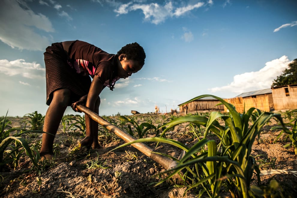 圖為一名在尚比亞為玉米田除草的農人。當局希望民眾改變飲食習慣的背後,和氣候變遷導致玉米田收成不佳有關。如果民眾改種其他較不受風災影響的作物,並且嘗試更多的主食選擇,或許能有效改善糧食危機和營養不良的問題。