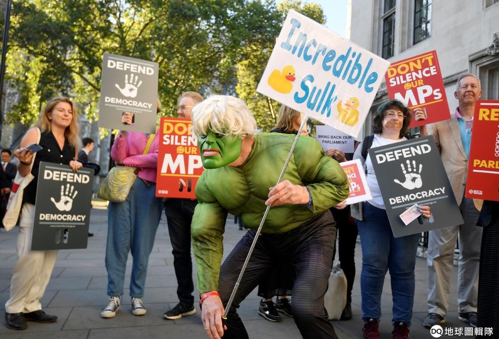 在位於倫敦的英國最高法院前,民眾手舉寫有「捍衛民主」字樣的告示牌抗議英國首相強生(Boris Johnson)的休會決定。目前,脫歐協疑因為北愛爾蘭邊境問題,遲遲無法取得共識。