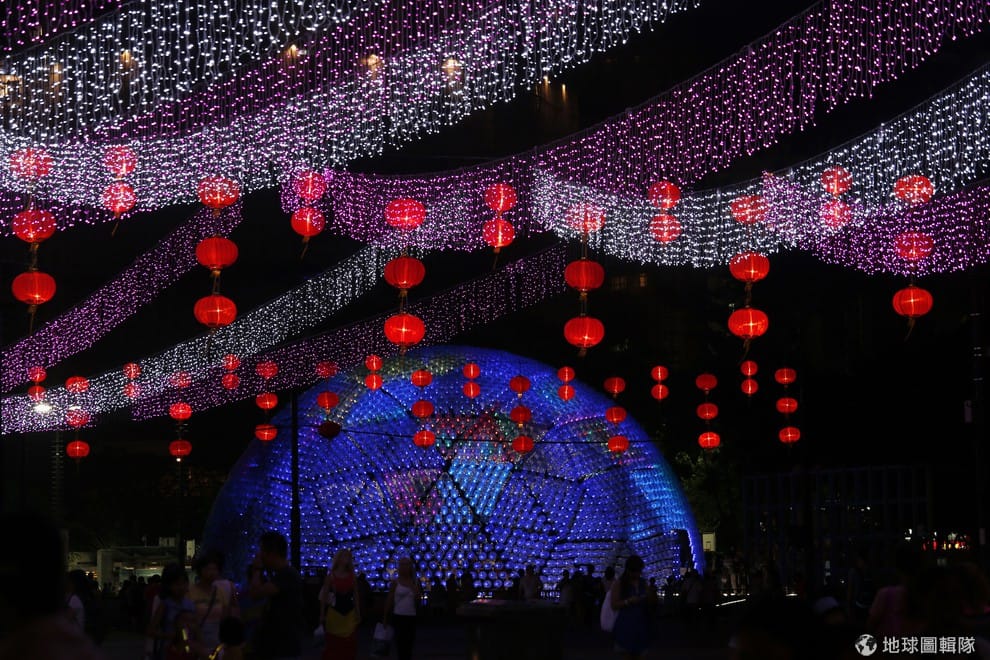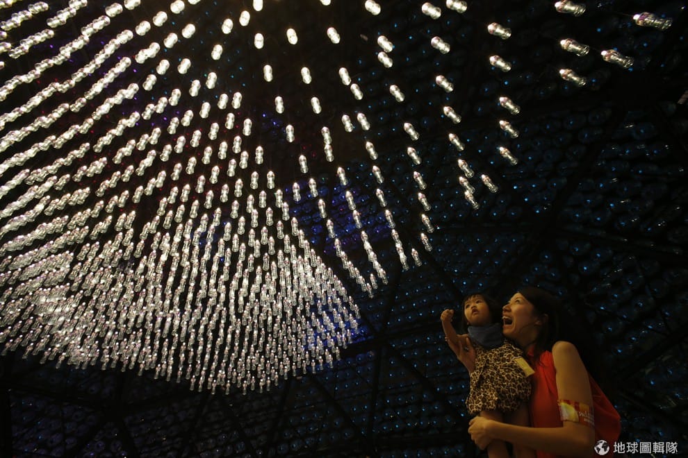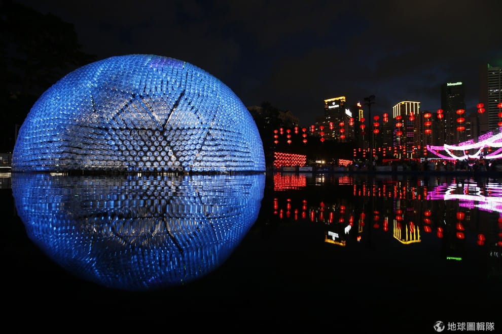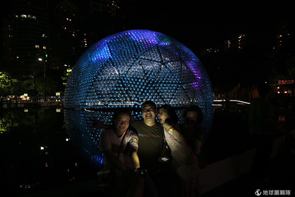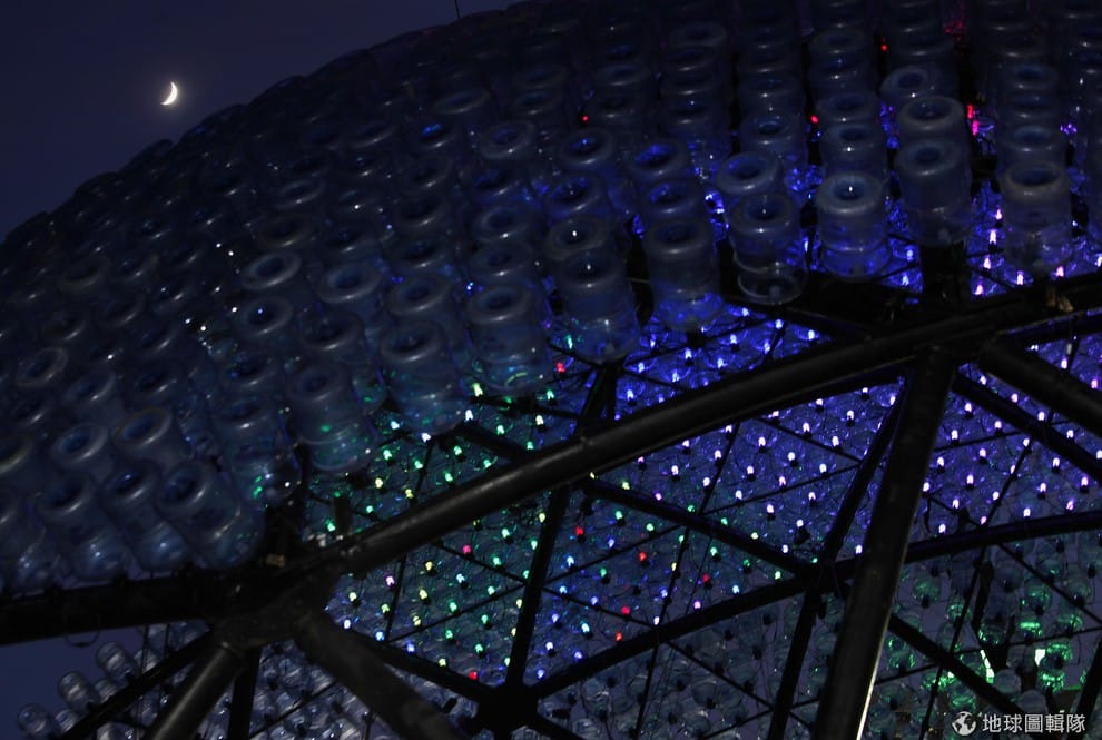 巨型月亮燈是由 7千個廢棄塑膠瓶做成的,外殼由 4848個塑膠瓶搭成,內部再加上 2300個塑膠瓶,每個瓶裡都有 LED燈泡,在夜晚的時候亮起燈光看起來魔幻又迷人,可說是兼具環保與藝術。