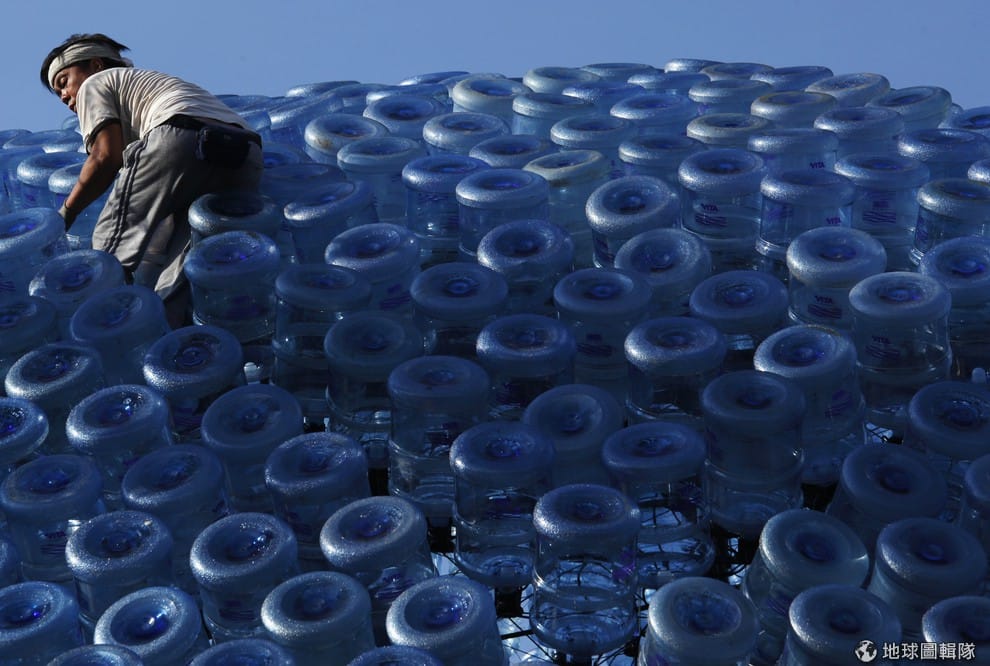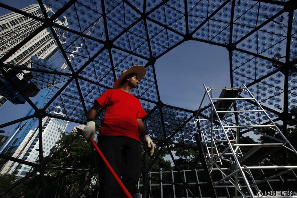 照片中的工人打著赤膊,將塑膠瓶一個個地安裝在鋼架上。