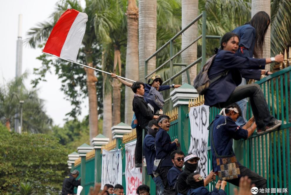 24號這天,爬上印尼國會建築柵欄的大學生揮舞著印尼國旗,反對破壞民主和人權的《印尼刑法修正草案》。