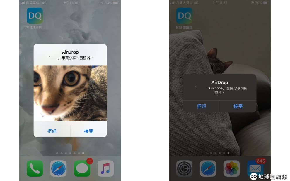 圖左為iOS 12的手機用AirDrop收到照片時會出現的畫面,圖右則為iOS 13的手機用AirDrop收到照片時會出現的畫面。可以發現最新版的iOS作業系統已經不會再自動預覽圖片。