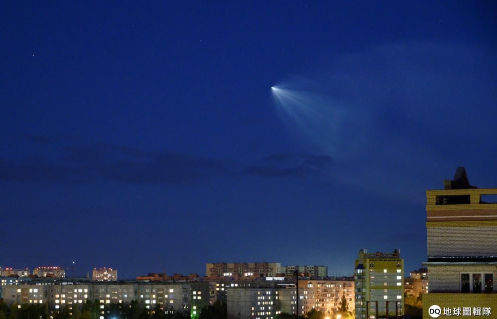 在俄國城市歐姆斯克(Omsk)的夜空中,可以看到載著曼蘇瑞一行人的火箭。