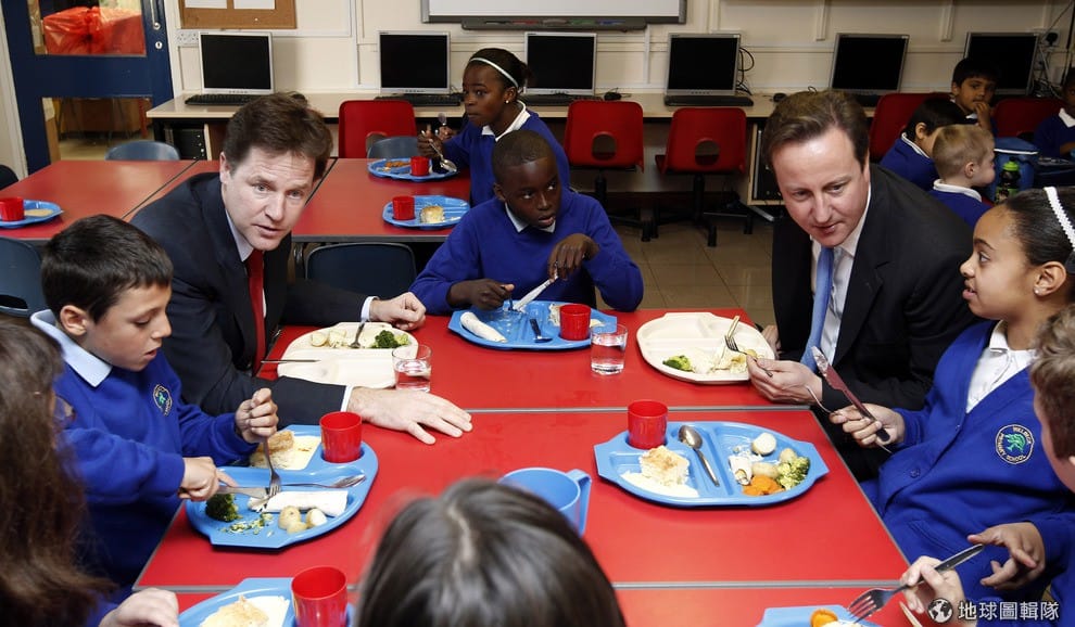 照片中為英國首相卡麥隆(右)、英國副首相克萊格(左)和小學學童一起在學校吃午餐。