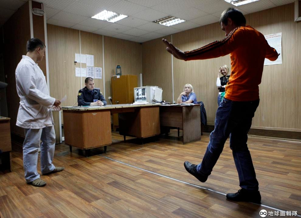 圖為 2010年8月在「解酒站」(Vytrezvitel),一名男子在藥癮精神科、警察的監控下進行酒測。「解酒站」來自蘇聯時期,當時警察能任意搜查喝醉的人、並將他們脫衣檢查後拘留在「解酒站」。這類帶有爭議的機構在 2011年已經全數關閉。