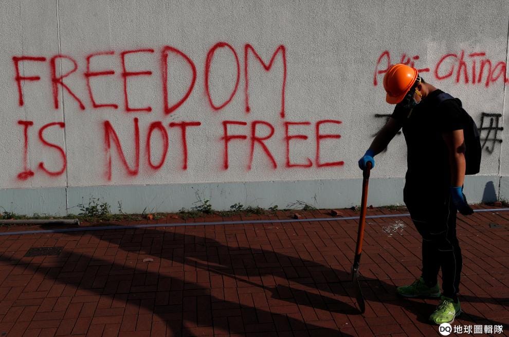 路透社 / 達志影像上圖為本月 1號,香港反政府示威現場,牆上的標語寫著「自由不是免費的」;下圖則是同一天在中國北京,人們拿著「香港明天會更好」的標語慶祝中國國慶 70周年。