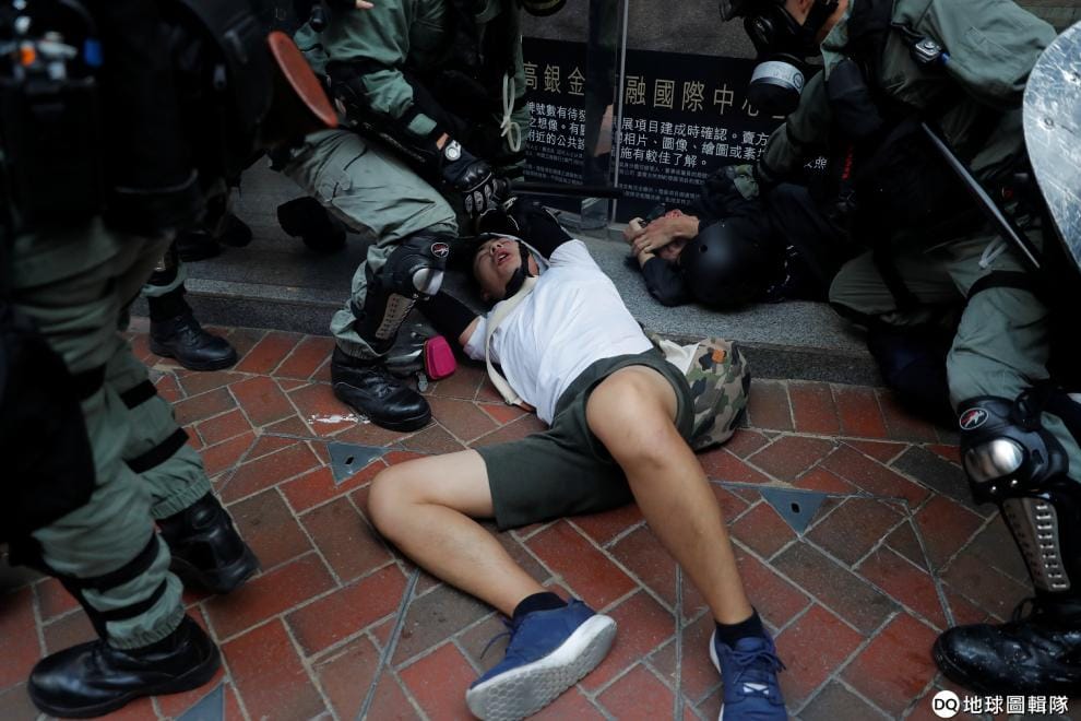 在旺角街頭,一名示威者遭到鎮暴警察壓制。