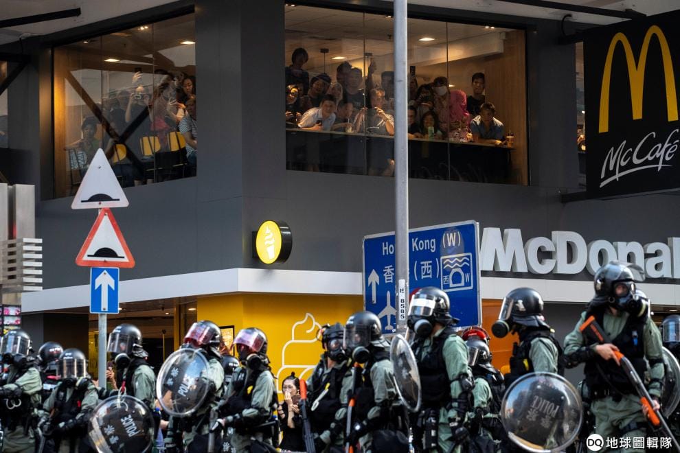 在深水埗的麥當勞,人們聚在窗口,看著樓下集結的鎮暴警察。