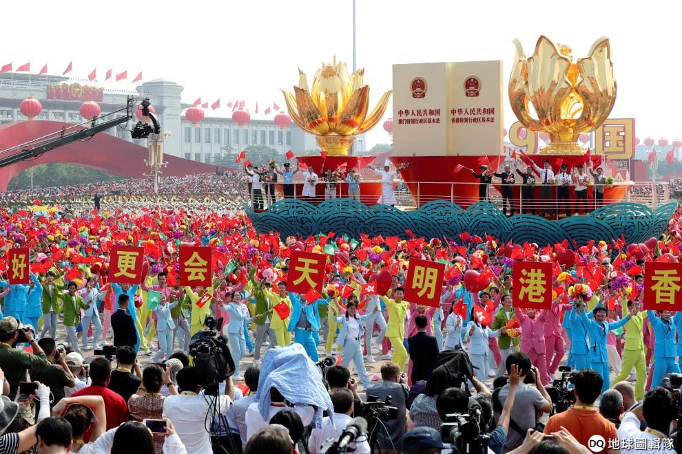 對照在中華人民共和國的建國 70周年現場,中國領導人習近平在演講上說:「要堅持『和平統一、一國兩制』的方針,保持香港、澳門長期繁榮穩定,推動海峽兩岸關係和平發展,團結全體中華兒女,繼續為實現祖國完全統一而奮鬥。」意圖描繪一個強大且安定的國家圖像,這一切也顯得格外迷離。