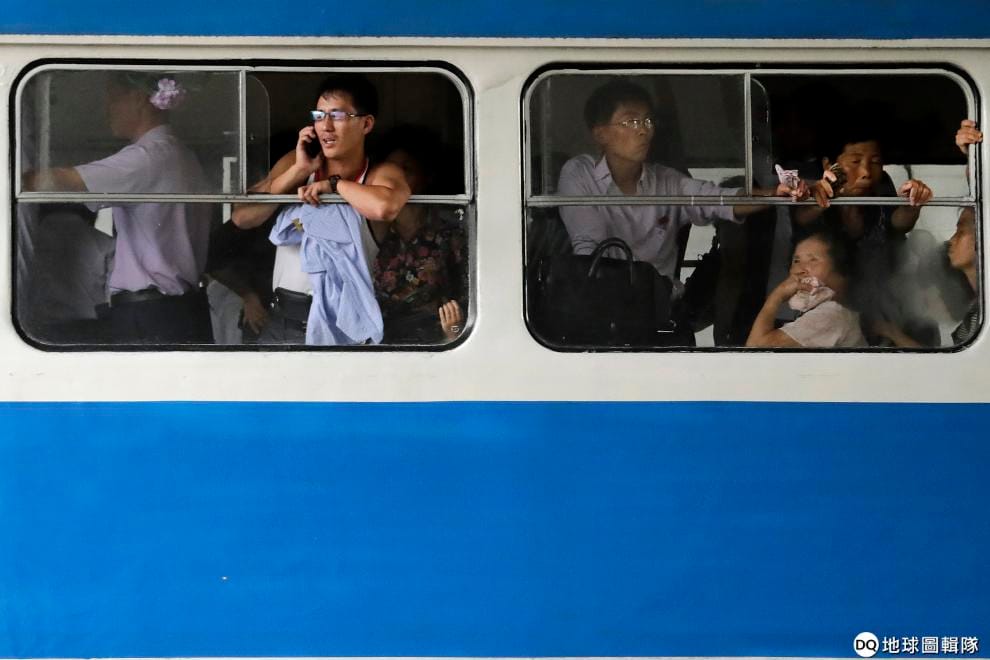 一名正在通勤途中的北韓上班族,在電車裡使用手機講電話。