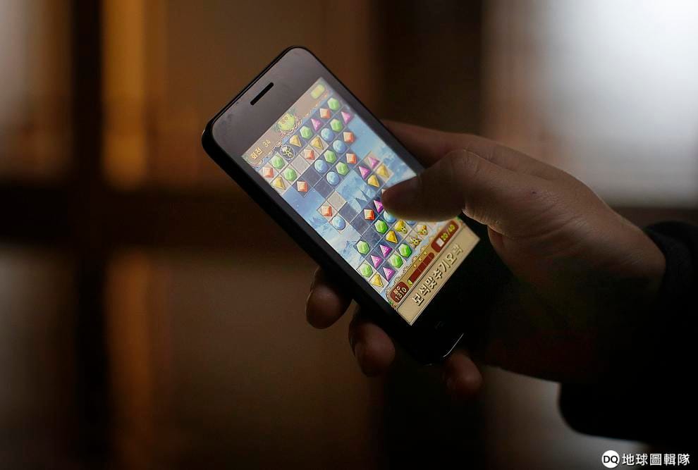 圖為一名北韓民眾正在使用智慧型手機玩遊戲。