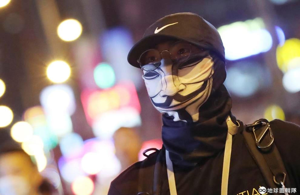 5號凌晨,在《禁蒙面法》上路後,一名示威民眾照樣戴著常在反政府示威遊行中出現的「蓋伊‧福克斯」(Guy Fawkes)面罩上街。