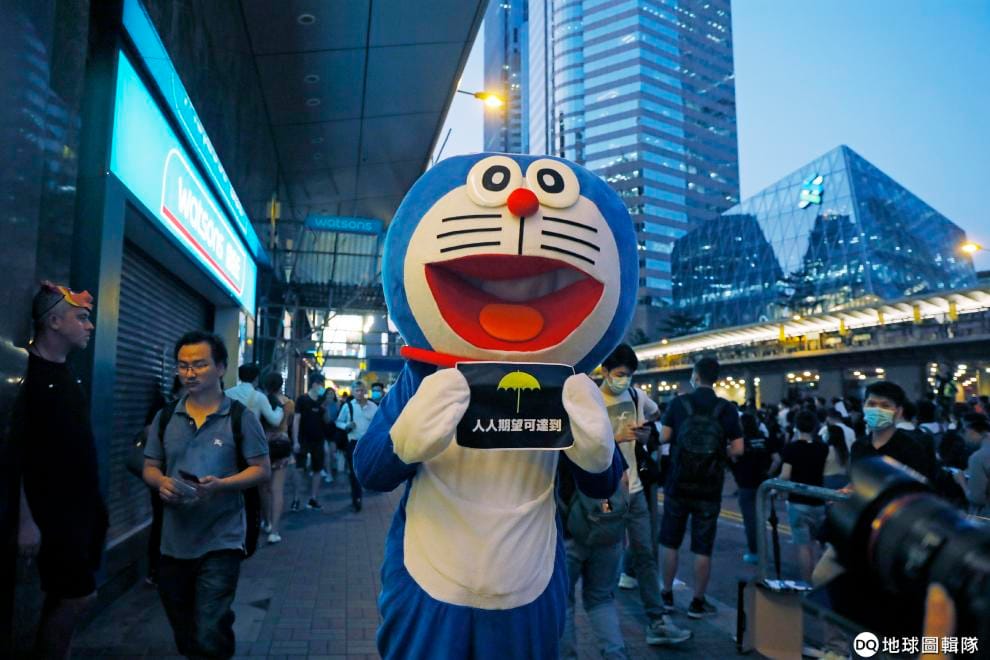4號下午,在香港政府宣布《禁蒙面法》準備上路後,香港街頭出現了穿著卡通裝的示威民眾,他們不只蒙面,而是把整個身體都遮掩了起來。
