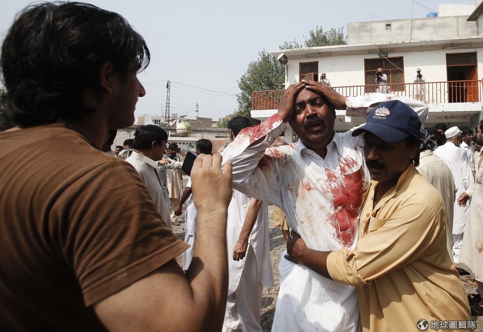 路透社一名男人因為弟弟在爆炸中死去而崩潰,他身上的白衣服沾滿紅色的血。
