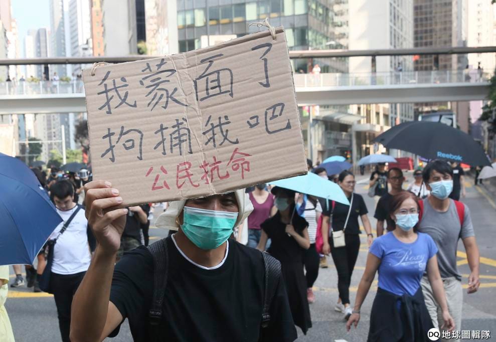 香港《禁蒙面法》上路這天,一名戴著口罩的示威民眾手舉寫著「我蒙面了,拘捕我吧,公民抗命」字樣的標牌上街。
