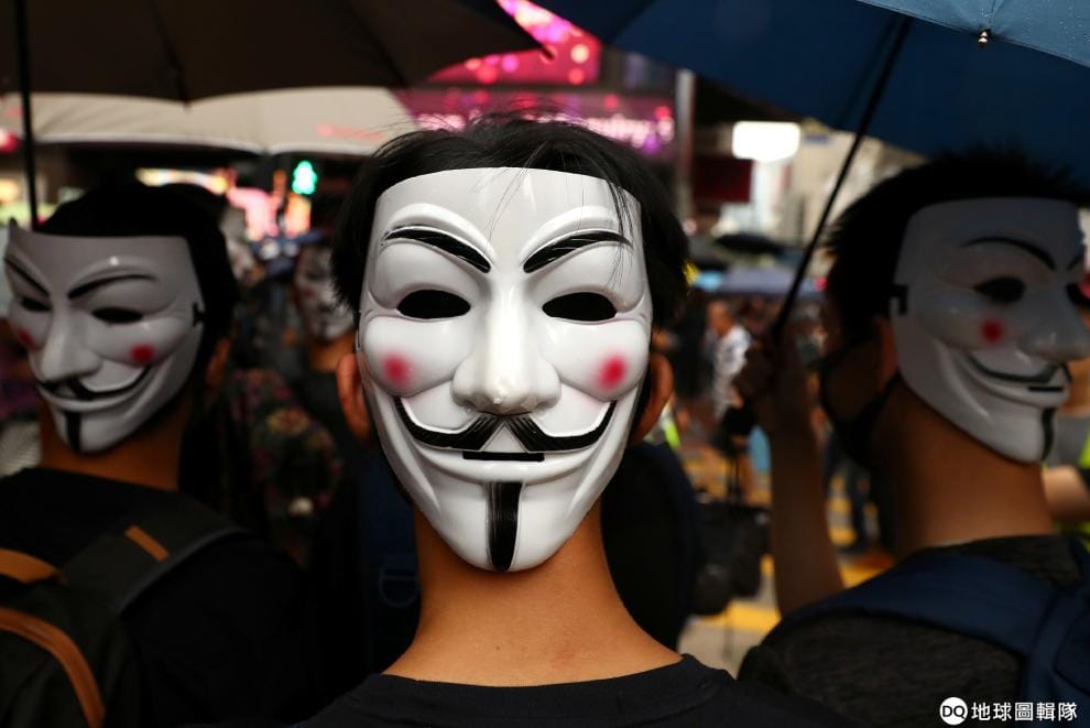 在香港《禁蒙面法》上路後,依舊有大批示威民眾蒙面上街反政府。圖為反戴「蓋伊‧福克斯」(Guy Fawkes)面具的示威民眾。