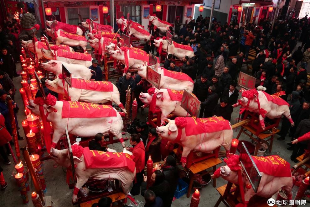 今年二月,在中國浙江省台州市歡慶農曆新年的現場,可以看到一頭又一頭的豬。
