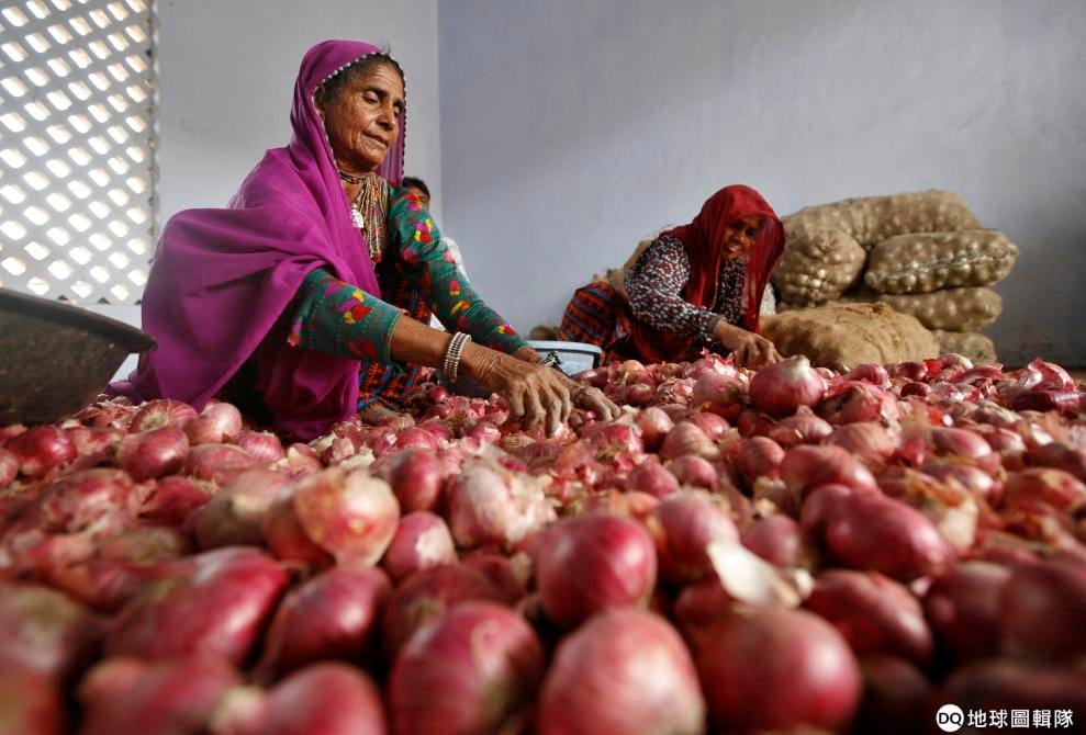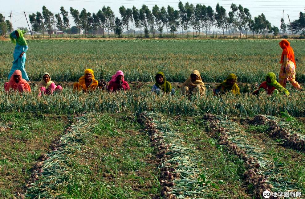 印度北部的哈里亞納邦裡,一群印度婦人在洋蔥田裡悉心照料洋蔥作物。
