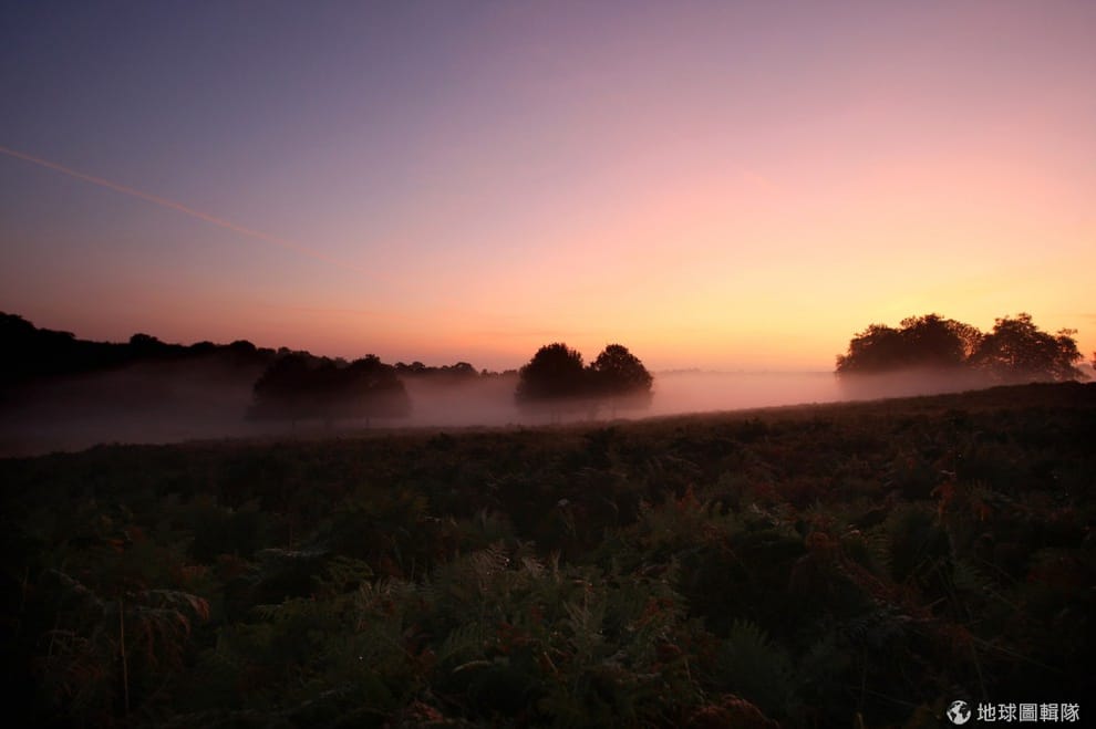 霧氣濃重,可以看見水珠在草叢間凝結發光。圖片來源:Dan Kitwood/Getty Images