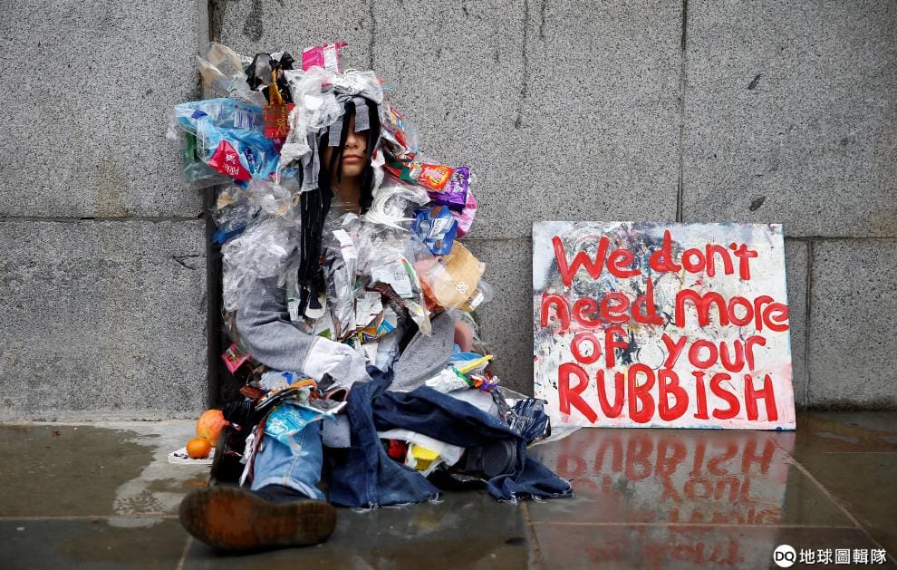 一名「滅絕反叛」示威者穿著用垃圾做成的衣服,坐在英國國會大樓外。他身旁的看板寫著:「我們不需要更多你們政府的垃圾屁話。」
