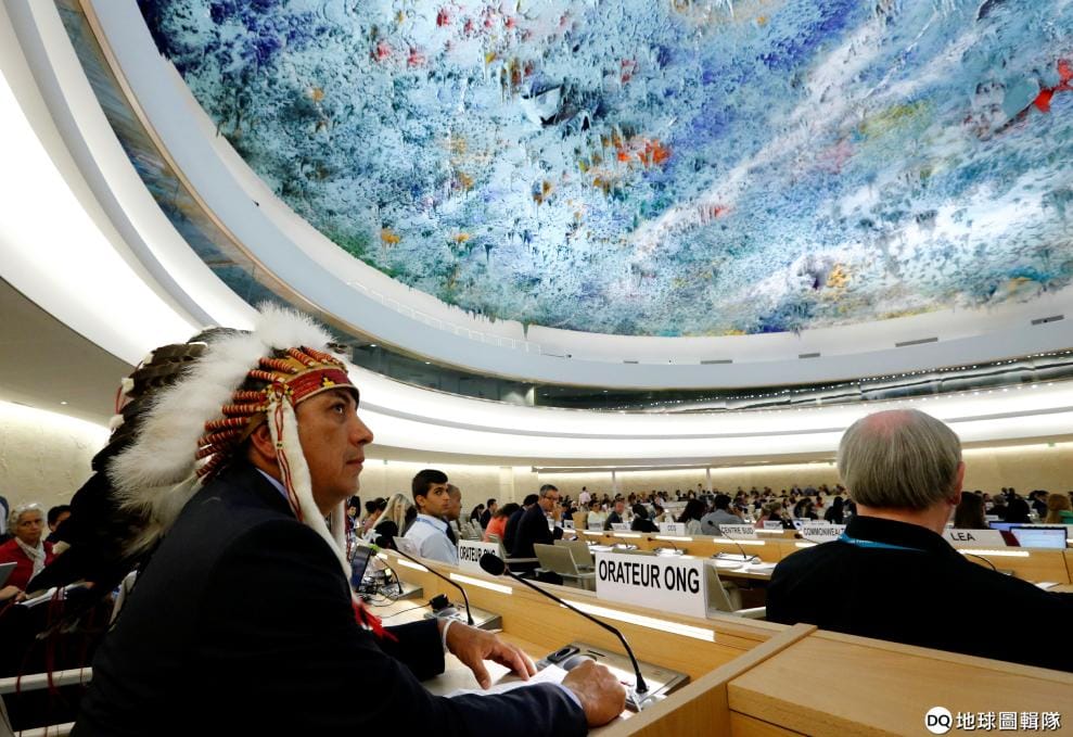 圖為 2016年9月,美國原住民族立岩蘇族(Rock Sioux)的族長到聯合國人權國家議會發表演說,表達他們反油管的訴求。