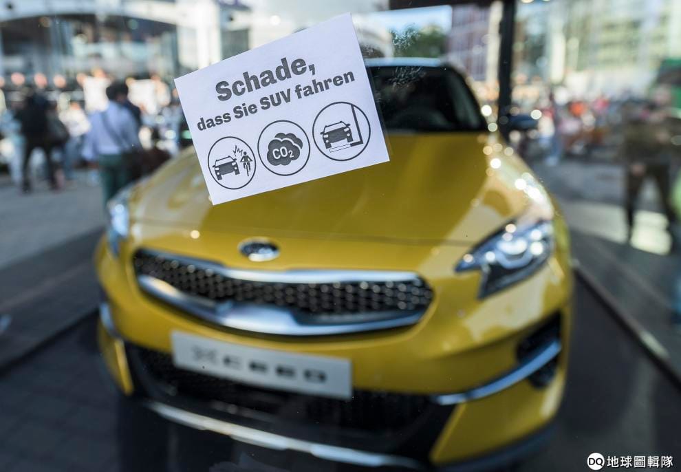 9月15日,一台在兩年一度法蘭克福車展展出的休旅車前的玻璃窗上,被示威者貼上寫著「你開休旅車,真是丟臉!」的傳單。