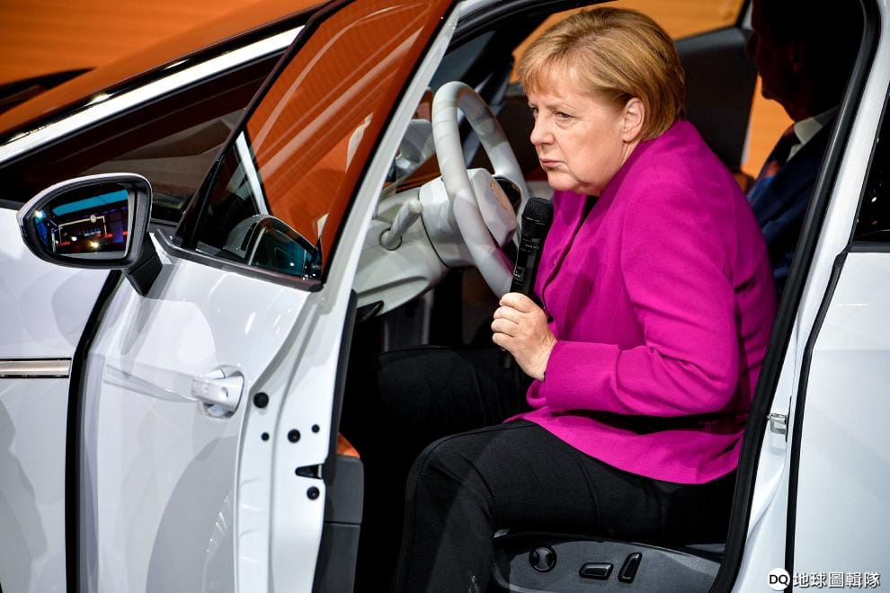 9月12日,德國總理梅克爾在兩年一度的法蘭克福車展上試乘最新的電動休旅車。