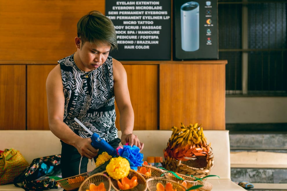 他與團隊們要參加一場在台灣的菲律賓選美比賽,參賽條件是利用回收物製作禮服。高中就接觸藝術的他對於禮服的呈現頗有想法,也做過類似的事情,因此從畫草圖、找材料、縫製禮服到化妝,他都能一手包辦。他還記得,他在那次的比賽裡一口氣製作了四套禮服,得到很好的評價。從此,只要同鄉們找他幫忙,若時間可以配合他都會趕到,不管是台北、台中還是高雄。