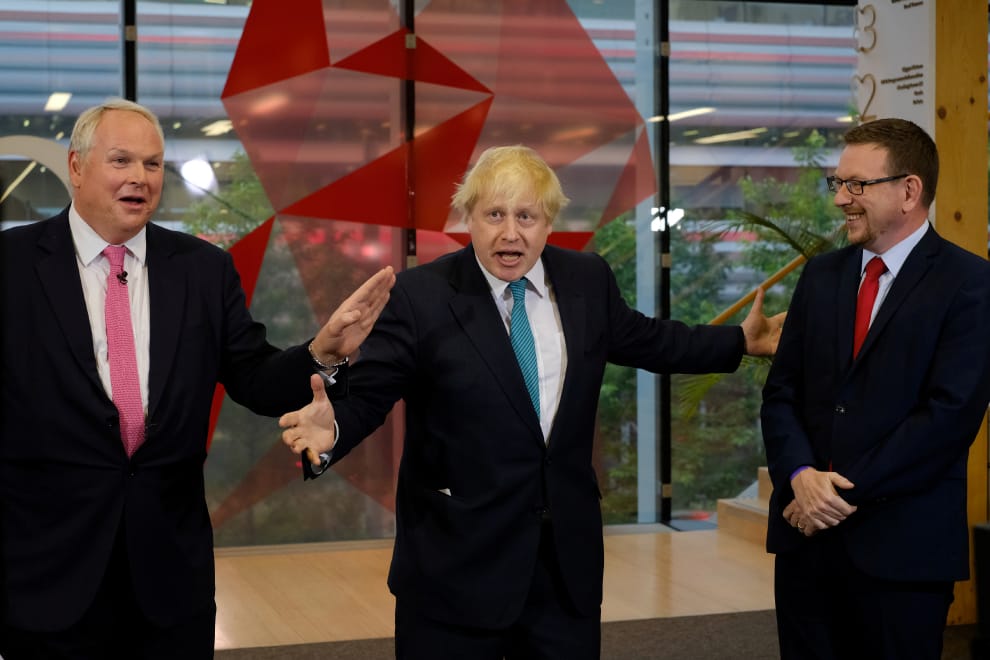 2017年5月,時任英國外交大臣的強生來到《天空新聞台》受訪,一旁是《天空新聞台》總編輯博爾頓(Adam Boulton,左),另一邊則是工黨下議院議員格恩( Andrew Gwynne,右)。
