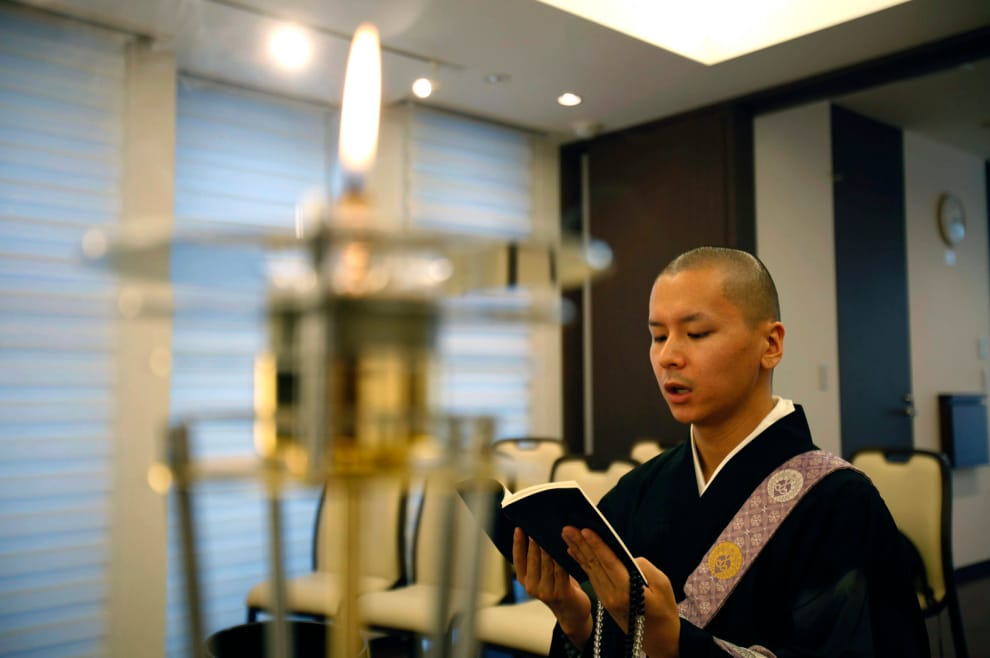 在日本神奈川縣的橫濱市,一名僧侶正在為亡者誦經。