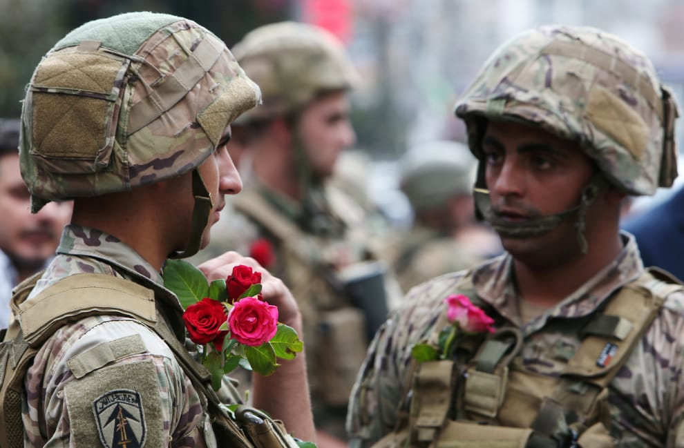 在位於南部的納巴泰市(Nabatiyeh),前來維安的軍人們戴上了抗議民眾給的玫瑰花。