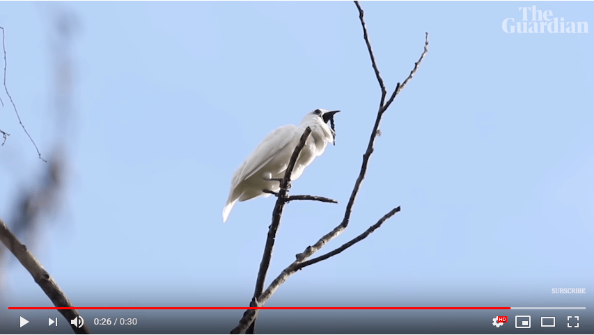 科學家公布了他們錄下的白鐘傘鳥啼叫聲和身影。白鐘傘鳥的啼叫聲有兩種音調,帶點金屬感的音色十分特別。觀賞影片請注意耳機或喇叭音量。
