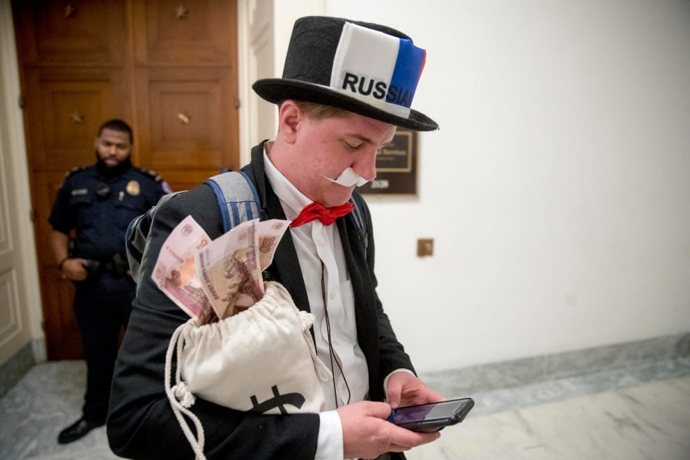 本月 23號,在Facebook執行長祖克伯參加聽證會現場,一名示威者打扮成桌遊「大富翁」的角色,抗議Facebook讓俄國有辦法利用社群力量影響 2016年美國大選。