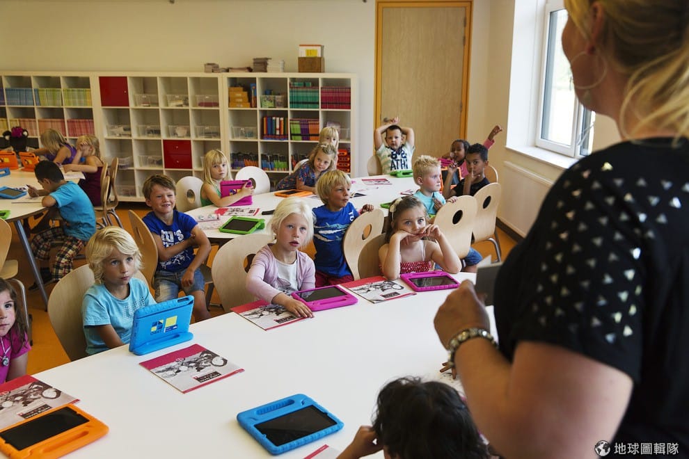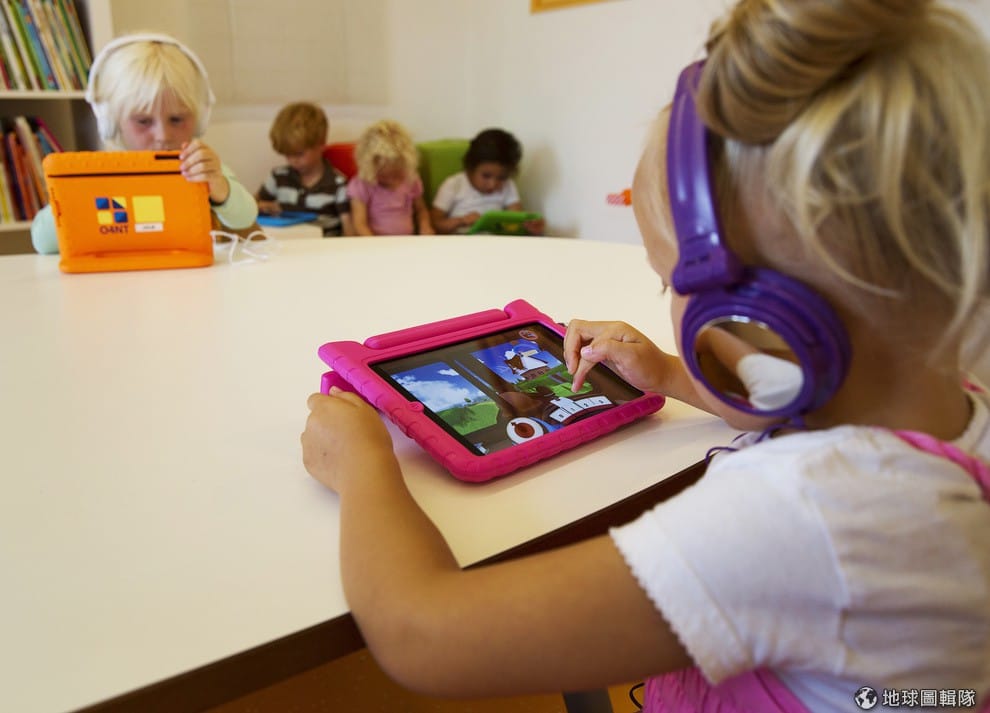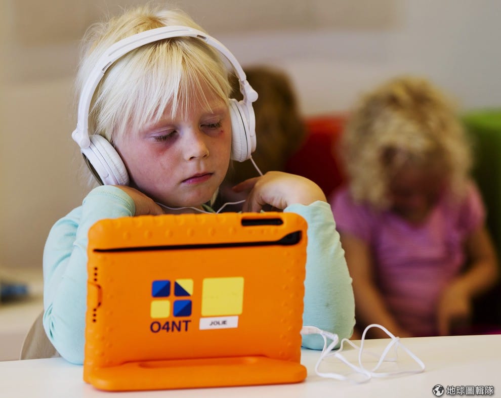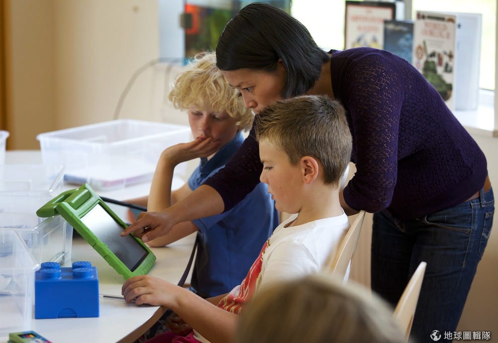照片中老師正在使用 iPad教孩子數學題目。隨著教學方法的改變,老師的角色也有所變化,O4NT組織就說到:「老師不再只是傳授知識給孩子,而是化身為教練支援孩子進行自己的作業和團體研究。」