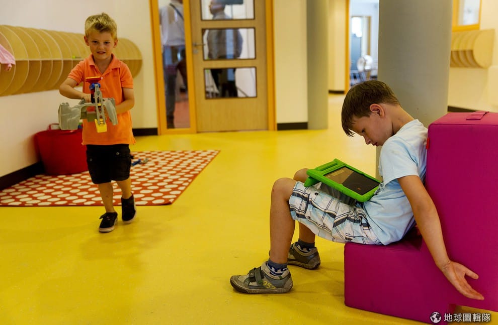 路透社休息時間的時候,一群小朋友圍坐在桌子旁邊用 ipad玩遊戲。