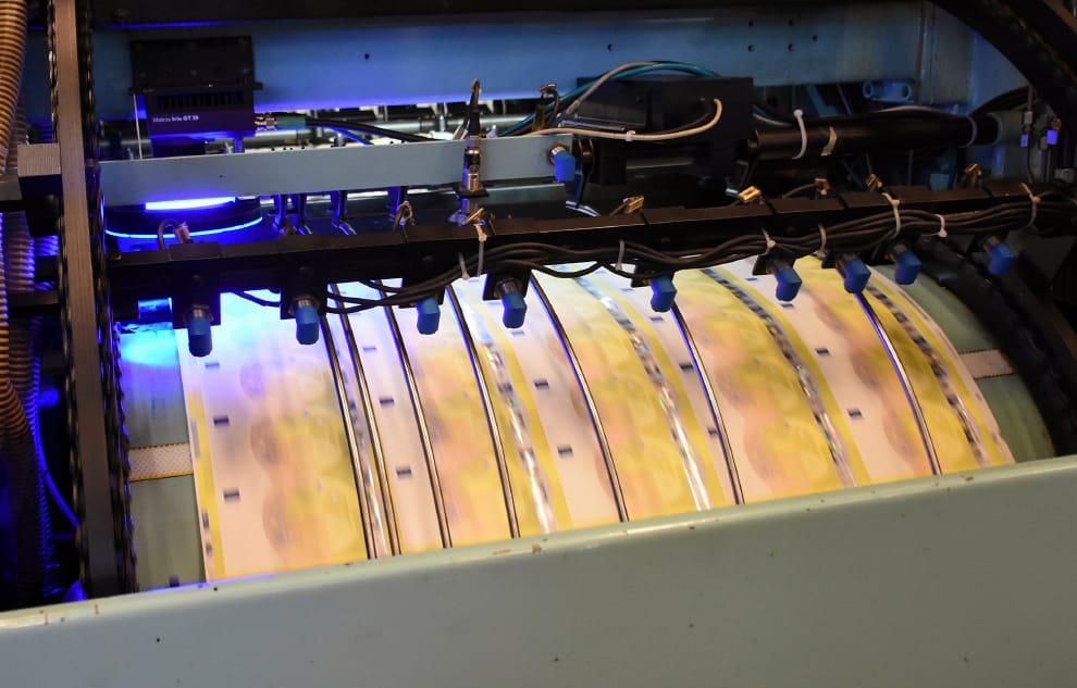圖為義大利的印鈔廠中,印鈔機正在高速運轉。