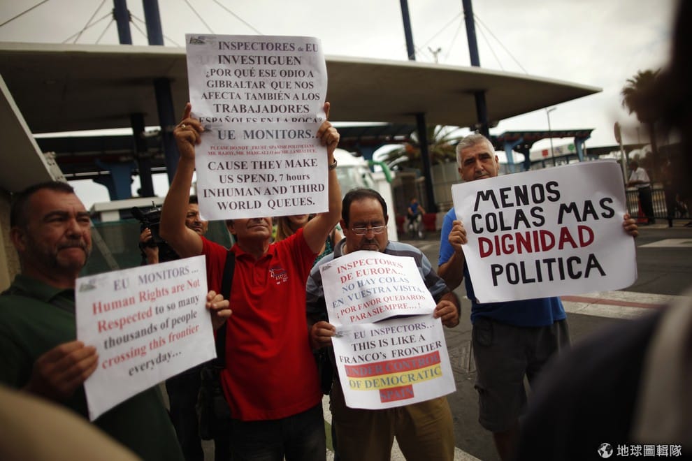 在直布羅陀工作的西班牙人舉牌抗議。目前估計有 8千人居住在西班牙境內,但每天通勤到直布羅陀上班,邊境檢查的加強影響了這些工作者的日常生活。