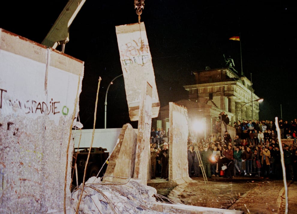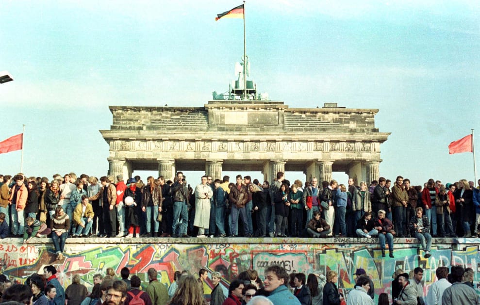 圖為 1989年11月10日,兩德政府宣布要拆遷柏林圍牆的第二天,可以看到西德民眾爬上位於布蘭登堡城門前的柏林圍牆慶祝。