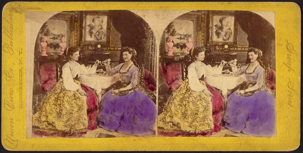 在這張圖片中,可以看到兩名女子一人各拿著三叉骨的一端,折斷比較多部分的人就可以許願,所以三叉骨又稱為許願骨。