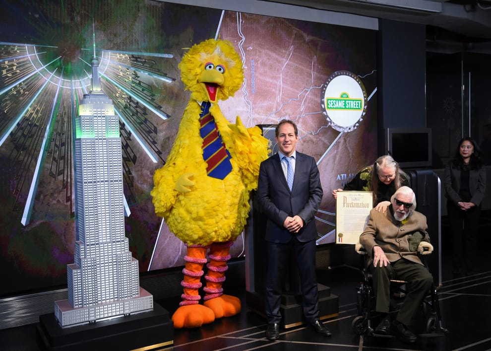 11月8日,在紀念《芝麻街》開播 50年的慶祝活動上,芝麻街工作室CEO楊伍德(Steve Youngwood)和坐在輪椅上、以操控大鳥聞名的退休布偶師斯平尼(Caroll Spinney)一起為帝國大廈點燈來慶祝。