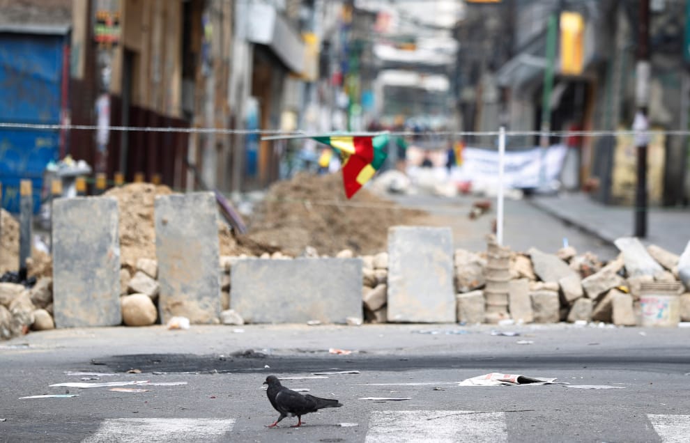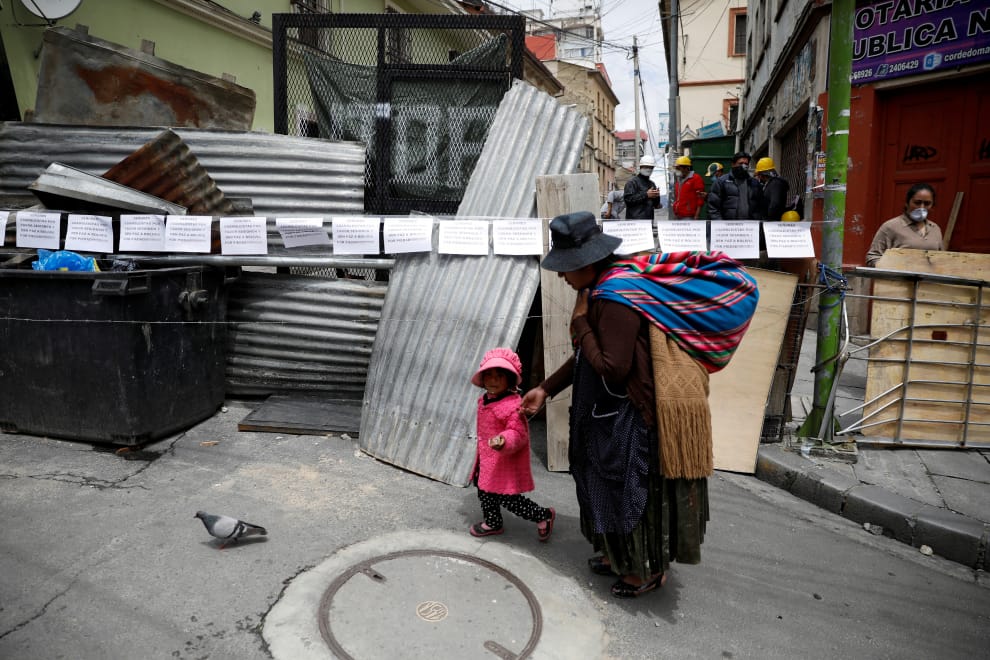 一名女子帶著小孩走過穆里略廣場附近的路障,路障上的標語寫著「議員請召開議會,憐憫玻利維亞、替玻利維亞帶來和平」。