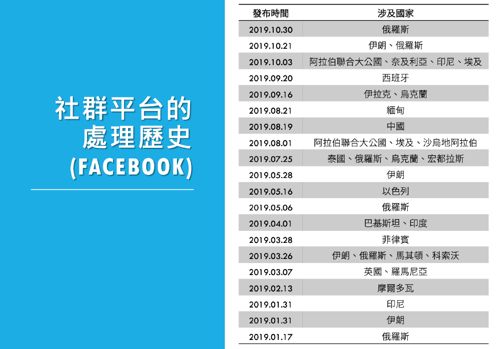 註二:我們一般常說的「資訊戰」,在Facebook是以協同性影響行動(coordinated influence operations)、協同性造假行為(coordinated inauthentic behavior)來稱呼。