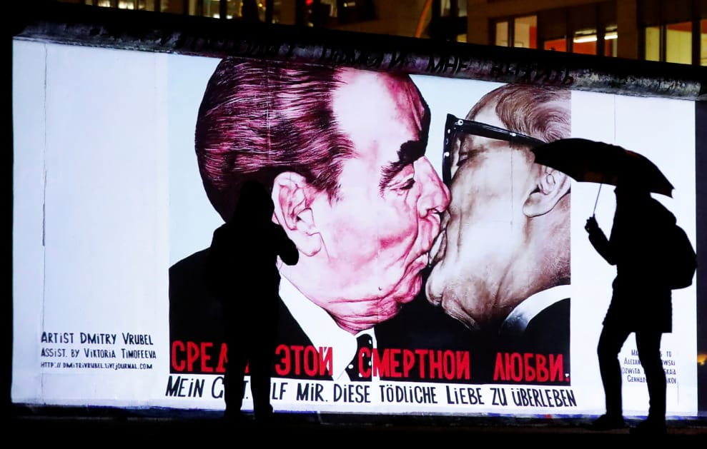 人們信步走過「兄弟之吻」的投射畫面,德國在本月 9號迎來柏林圍牆倒塌 30周年,而這幅「兄弟之吻」可說是柏林圍牆上的經典圖像。